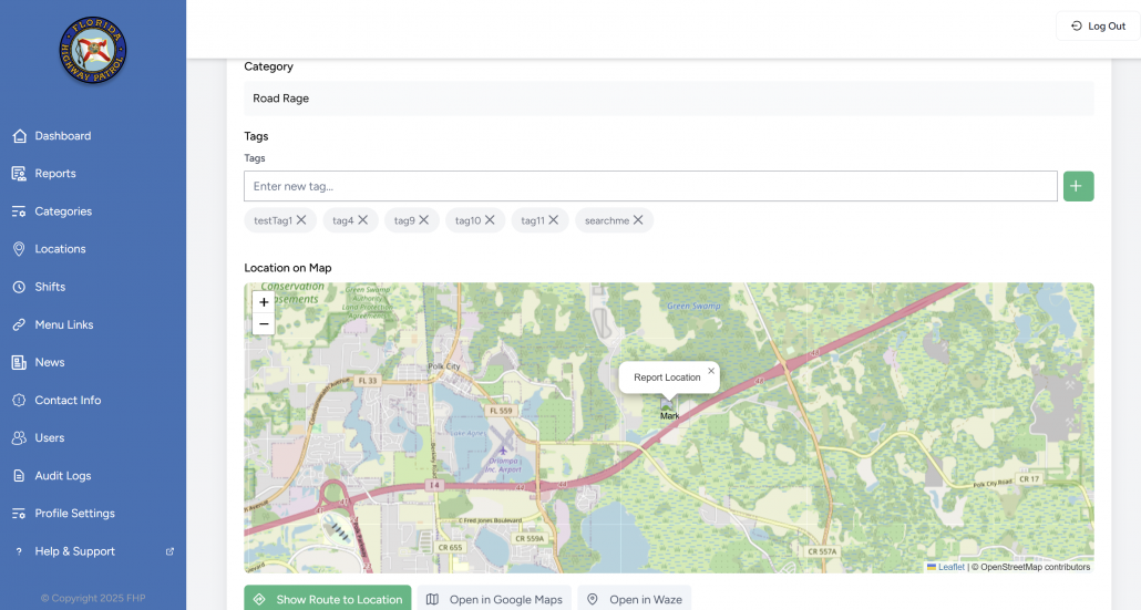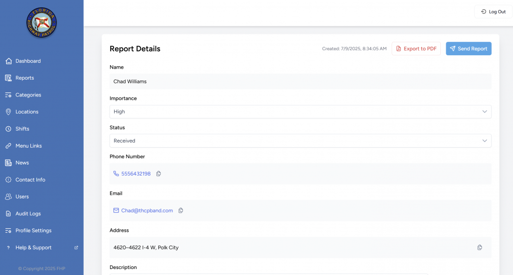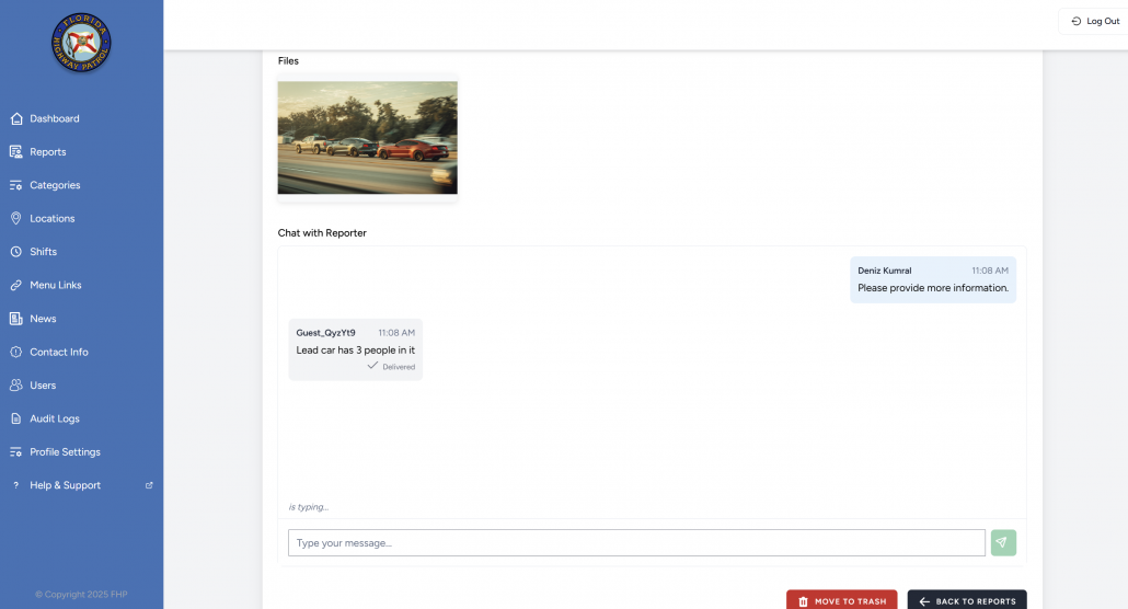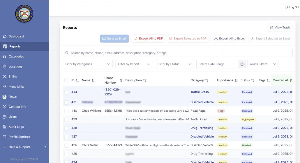 The Reports section is the core feature of the FHP Admin Panel. It allows officers to review and manage citizen-submitted tips. Reports may include personal information, category tags, descriptions, chat messages, and location data.
