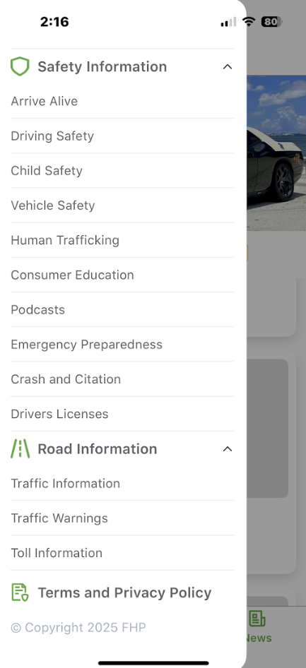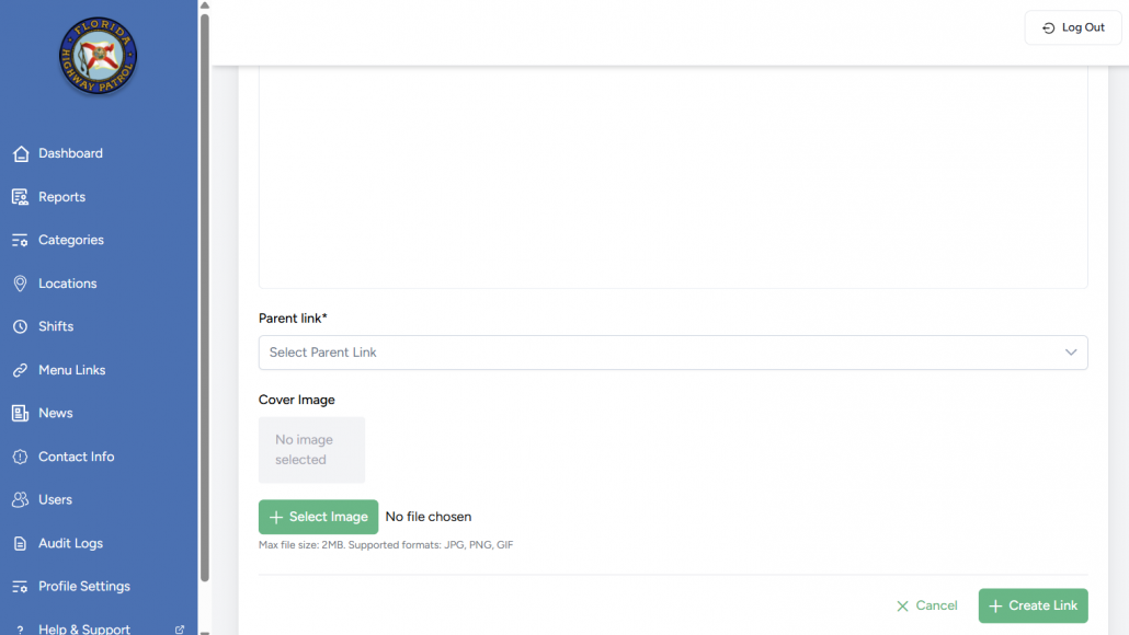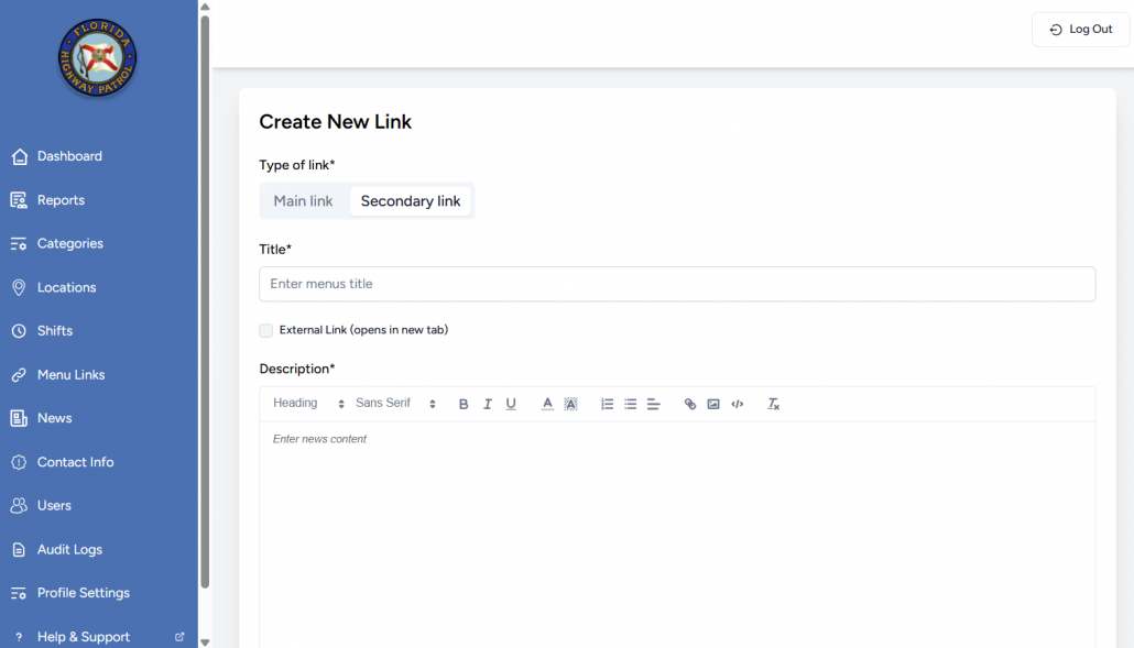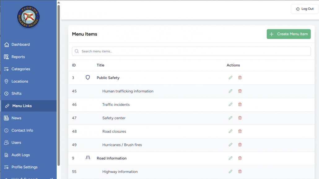 The Links section controls the dynamic menu in the FHP mobile app, where citizens access resources such as Public Safety, Road Information, Government Resources, and more. Users with the Editor or Admin role can manage these menu items.