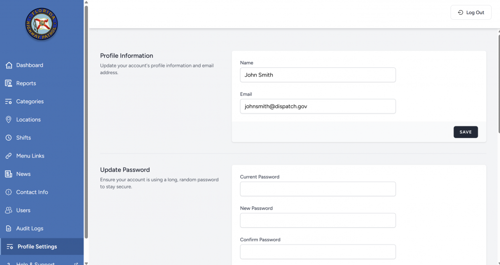 The Profile Settings section allows users to manage their account information, passwords, authentication, and browser session security. It is accessible to all user roles — Admin, Dispatch, and Editor — and includes multiple sub-features to ensure personalized and secure access.